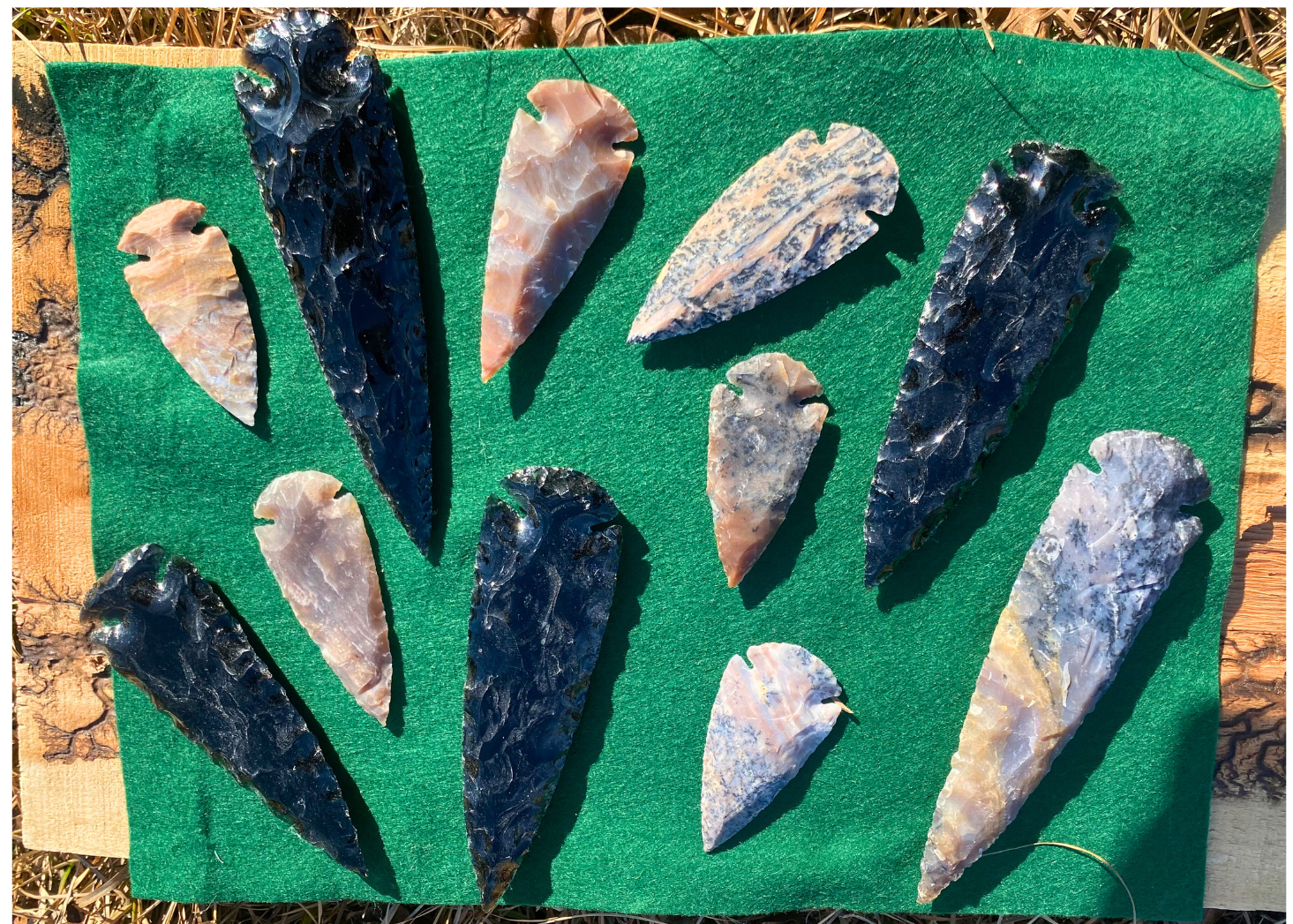 This exclusive 8-piece arrowhead and spear point set is individually curated from hand-crafted knapped stone pieces—each one unique, with its own shape, color, and craftsmanship. No two sets are ever the same.
